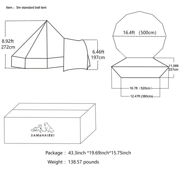 • [Perfect for Family Camping] – The 4M canvas tent bell tent has a diameter of 13 feet, a peak height of approximately 8 feet, and side wall height of 1.9 feet, providing ample space for 2-4 people and allowing you to stand inside. The 5M bell tent measures 16.5 feet in diameter, with a height of up to 9 feet and a sealed bottom perimeter that is insect-proof, making it perfect for family camping.