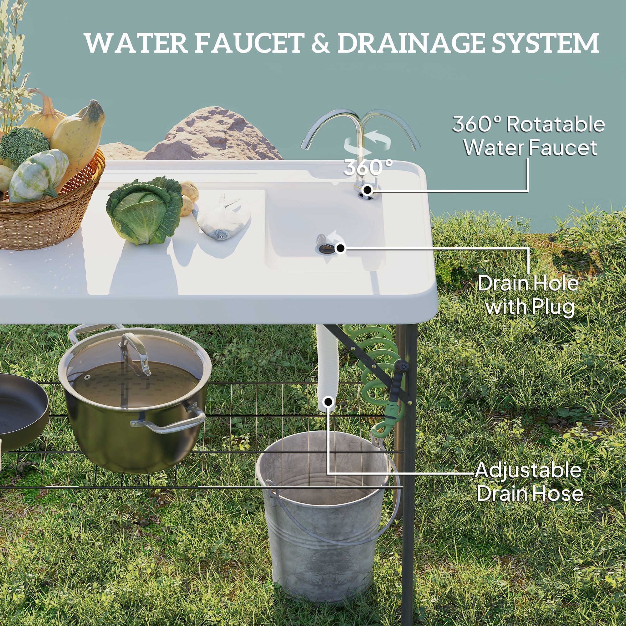 Discover the convenience of the Outsunny fishing table, your great outdoor companion! This table features a stainless steel faucet and spray nozzle for powerful cleaning, a built-in sink with an adjustable drain pipe, and a three-way hose connector. This outdoor prep table with sink is a great addition to your camping or fishing gear and is great for any fish cleaning or outdoor cooking task.