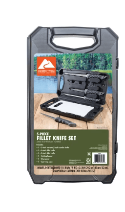 The Ozark Trail 5-Piece Fish Fillet Knife Set is the ultimate portable solution for anglers who need reliable tools on the go. Whether you're fishing by the lake or prepping your catch at camp, this all-in-one kit includes a sharp and flexible stainless steel fillet knife, a knife sharpener to keep your edge razor-sharp, a pair of protective fillet gloves, and a durable storage case for easy transport and organization. Designed for both casual fishers and seasoned anglers, this versatile set makes fish cleaning safer, easier, and more efficient.