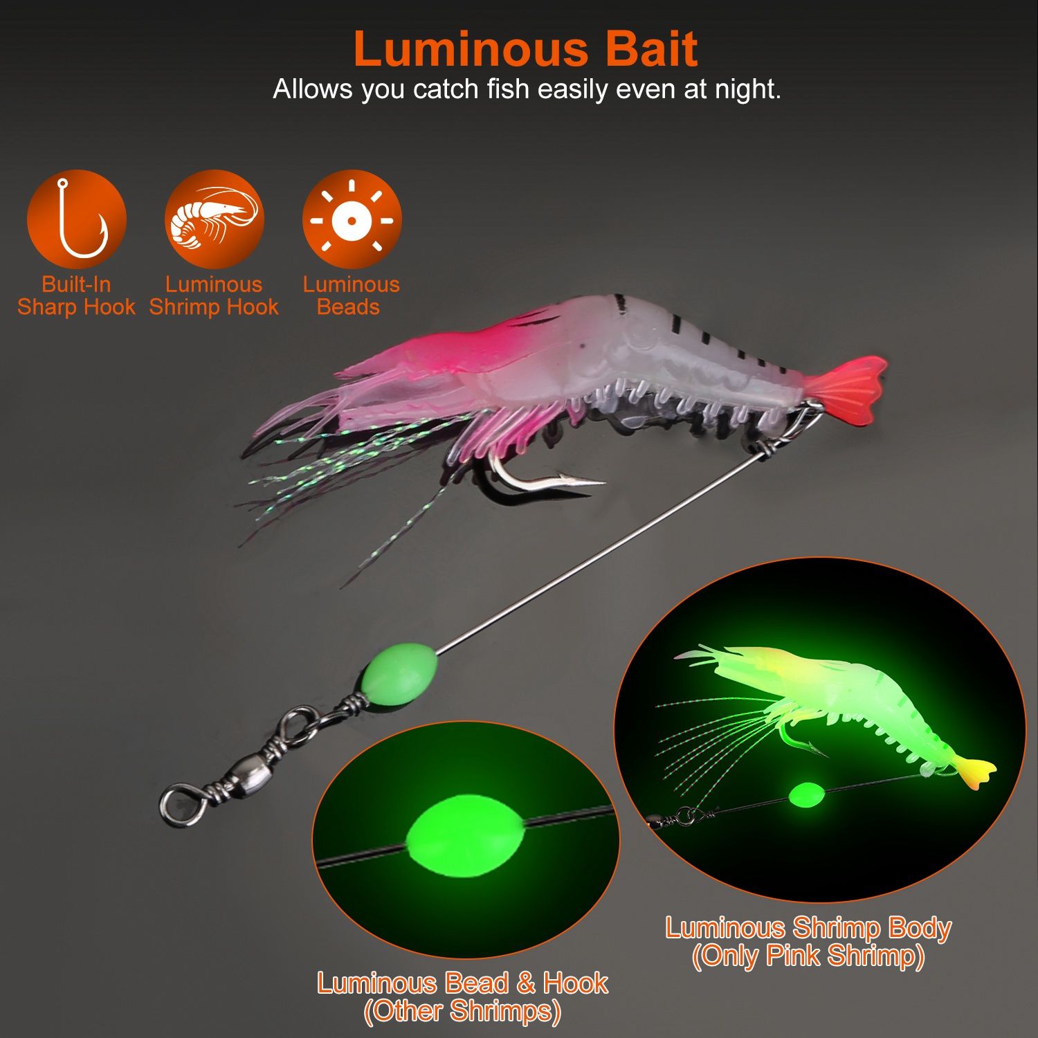 *Luminous Beads*:The built-in hooks are featured with fluorescent material bead that can glow in the dark; which allows you catch fish easily even at night. Besides; the pink shrimp also can glow in the dark which can be used at night for better fishing.