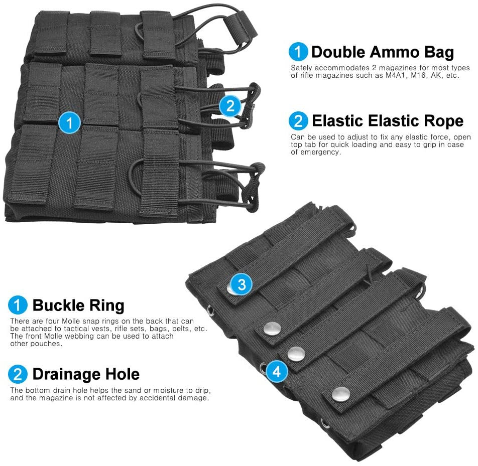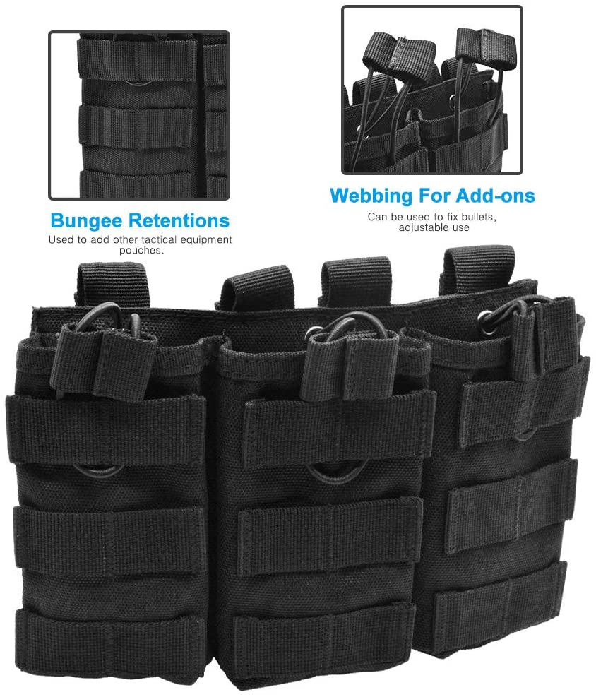 | Ideal For Anyone Using The Lightweight And Minimalist Mindset To Determine Your Loadout Lightweight and low profile airsoft mag pouch -- let you leave the pouch in when not storing mags without the extra bulk | TRIPLE OPEN-TOP MAG POUCH This mag holder will carry two mags, suitable for most of the small caliber rifle magazine, including but not limited to 30-round M4/M16 magazines, HK416 magazines Specifications Material: 1000D Nylon | RACHSA MAG POUCH Molle webbing on the front allows you to expand carrying capacity. Molle straps on the back can simply be attached to your tactical belt, military vests, backpack, radio pouch, rifle case, magazine holster,molle mag pouch etc. |